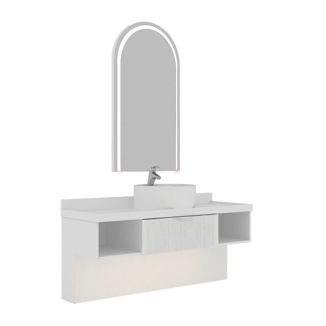 Dayanıklı akrilik tablası, hijyenik seramik lavabosu ve gold paslanmaz detaylarıyla estetik ve kaliteyi bir araya getirir. Entegre pleksi LED aydınlatmalı aynası, kullanım konforunu artırırken, geniş saklama alanları düzeni ve pratikliği ön plana çıkarır.