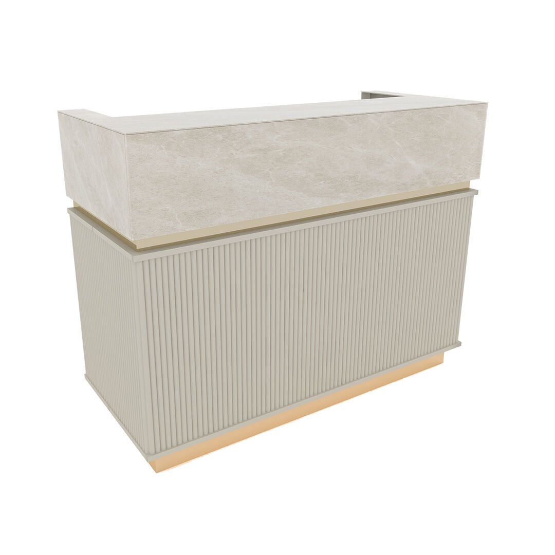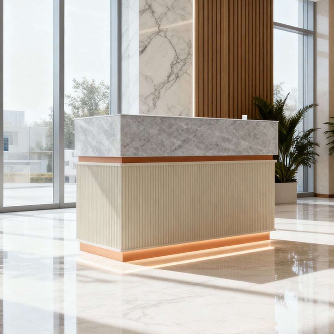 Royal Desk, karşılama alanlarında zarafet ve düzeni ön plana çıkaran güçlü bir mimari duruş sunar. Yüzeylerin sakin birleşimi ve ışığın yumuşak yayılımı, mekâna hem profesyonel hem de sıcak bir atmosfer kazandırır. Dikey ritme sahip gövde yapısı ve modern hatlarıyla, kliniğin genel kimliğini güçlendiren etkili bir odak noktası oluşturur.